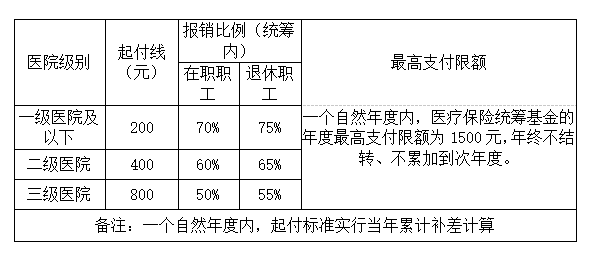 根據(jù)實際設定統(tǒng)一的門診統(tǒng)籌基金年度起付標準、支付比例和最高支付限額,不同級別的定點醫(yī)療機構設置差異化的起付標準和支付比例,適當向基層醫(yī)療機構傾斜,促進分級診療。對符合基本醫(yī)療保險基金支付范圍的費用,由基本醫(yī)療保險按照下表報銷政策進行支付。